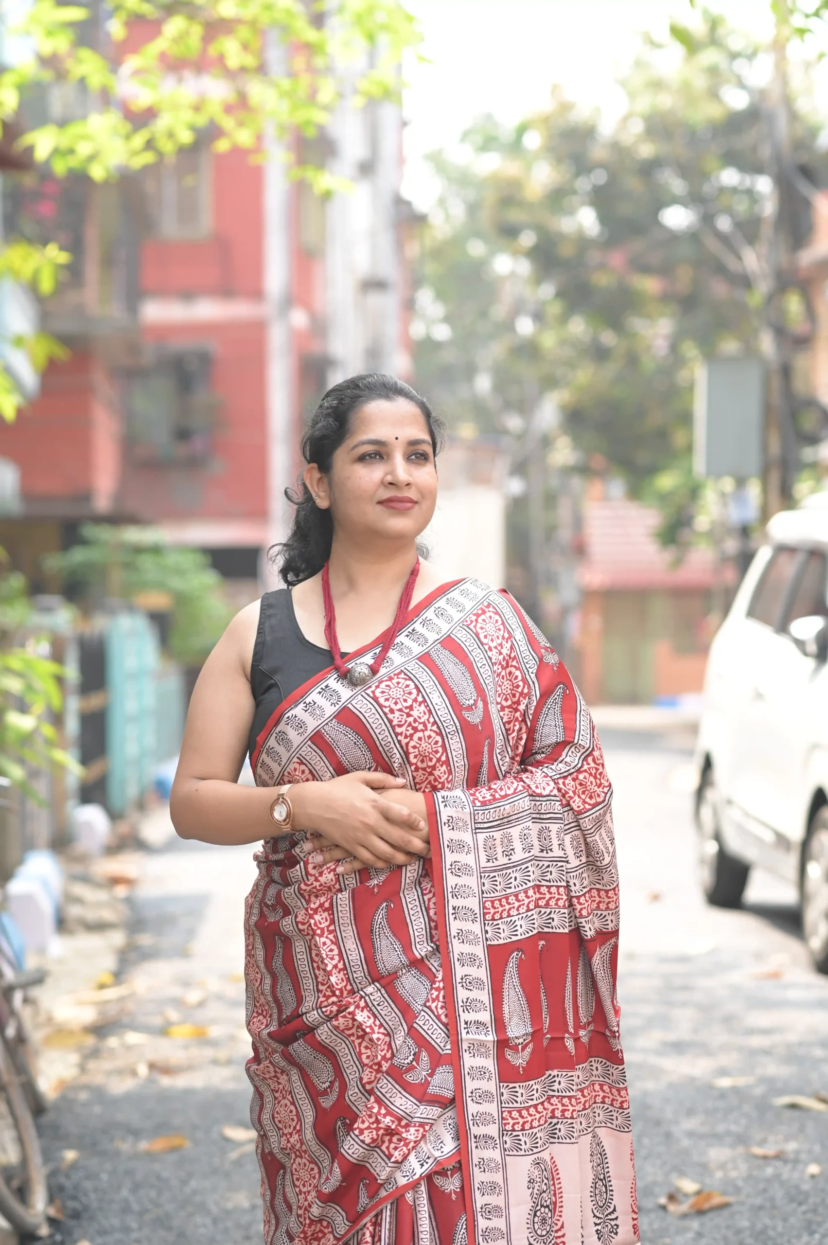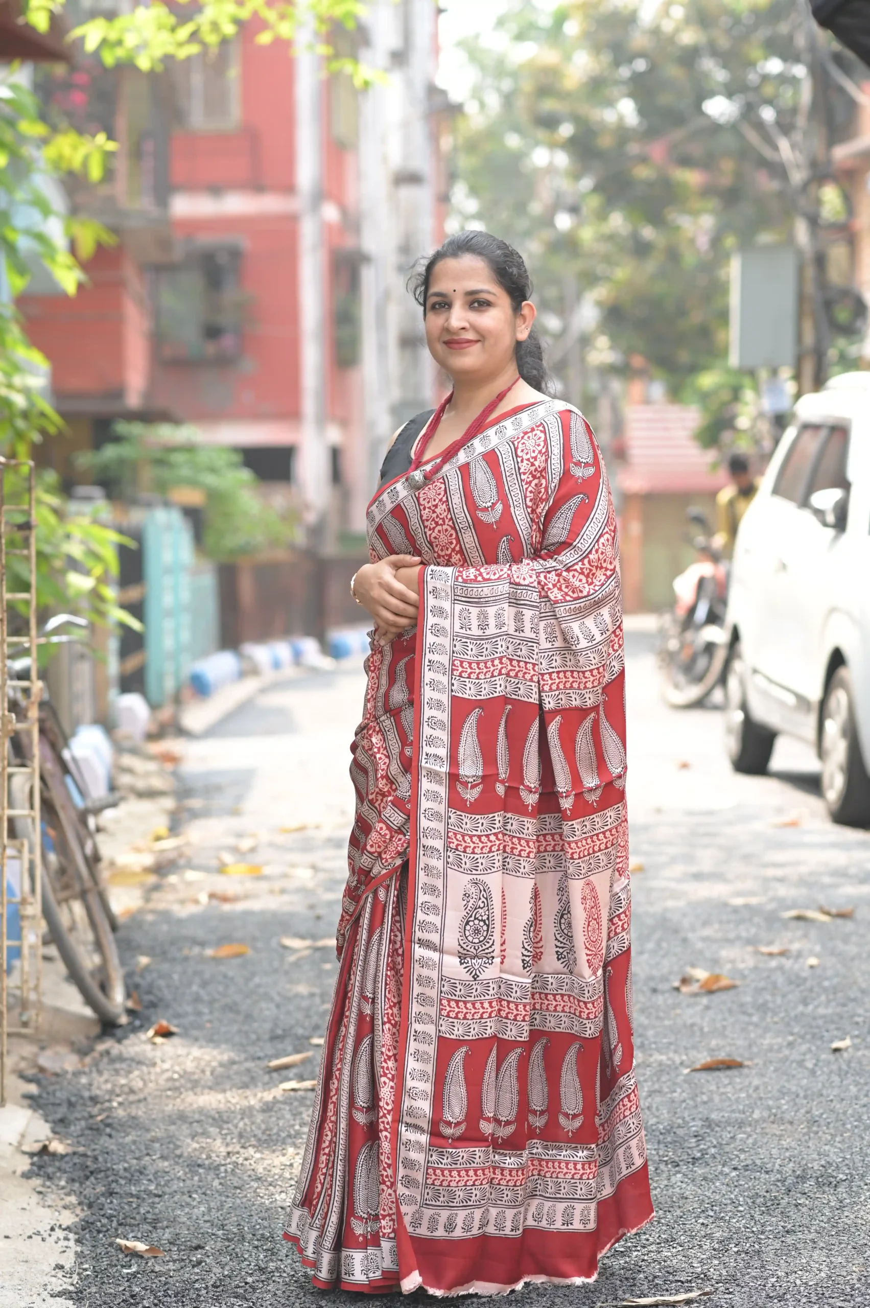 This saree is a versatile masterpiece. For a bohemian-chic look, pair it with a black sleeveless blouse and chunky oxidized silver jewelry. To elevate it for a formal evening event, opt for a coordinated red silk blouse and gold accents.