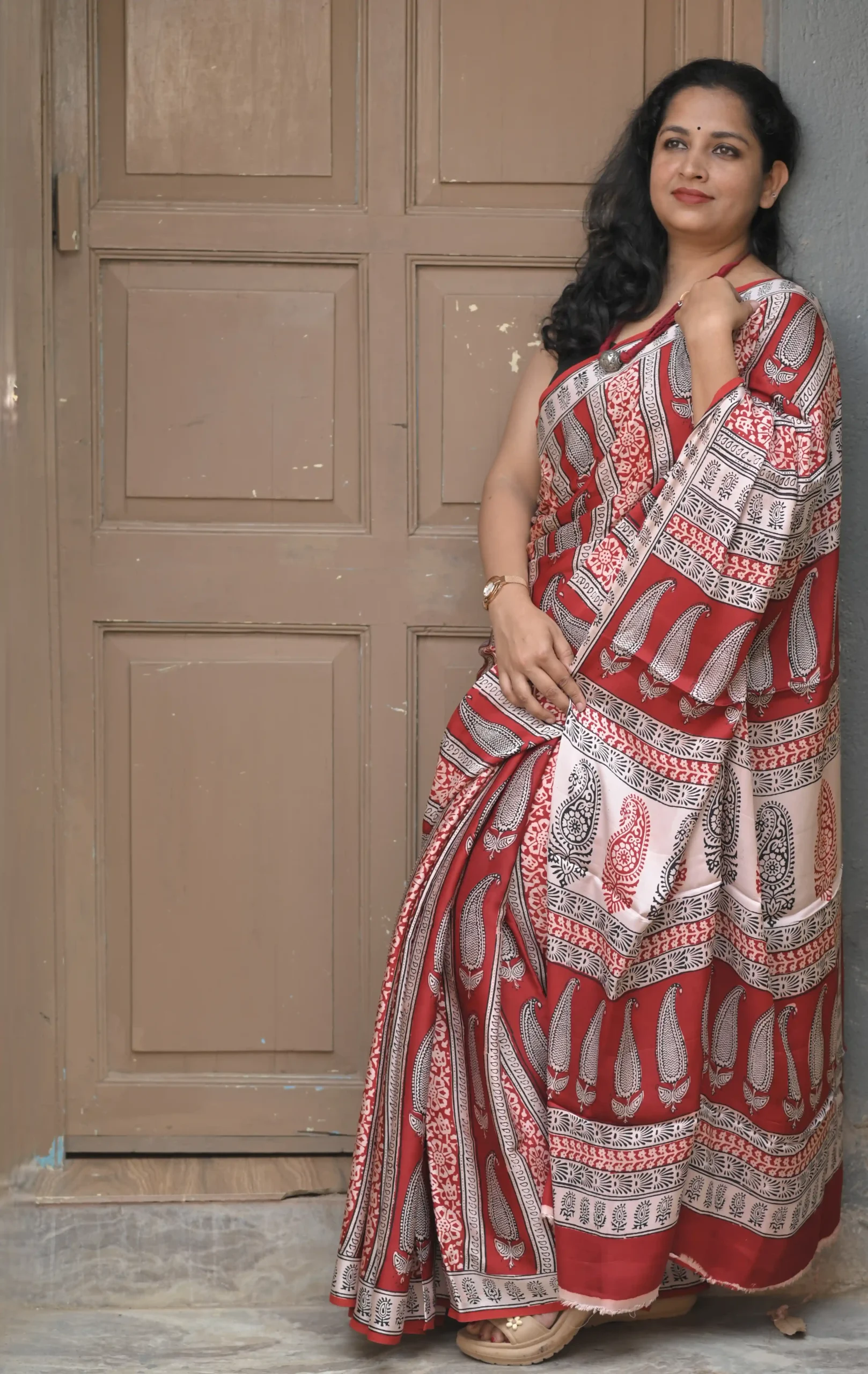 This Bagh Hand Block Modal Silk Saree is a stunning tribute to traditional craftsmanship, blending the heritage of hand-block printing with a contemporary, high-sheen fabric. Featuring a rich palette of terracotta red, cream, and deep charcoal, this saree is designed for the woman who appreciates the “earthy meets elegant” aesthetic.