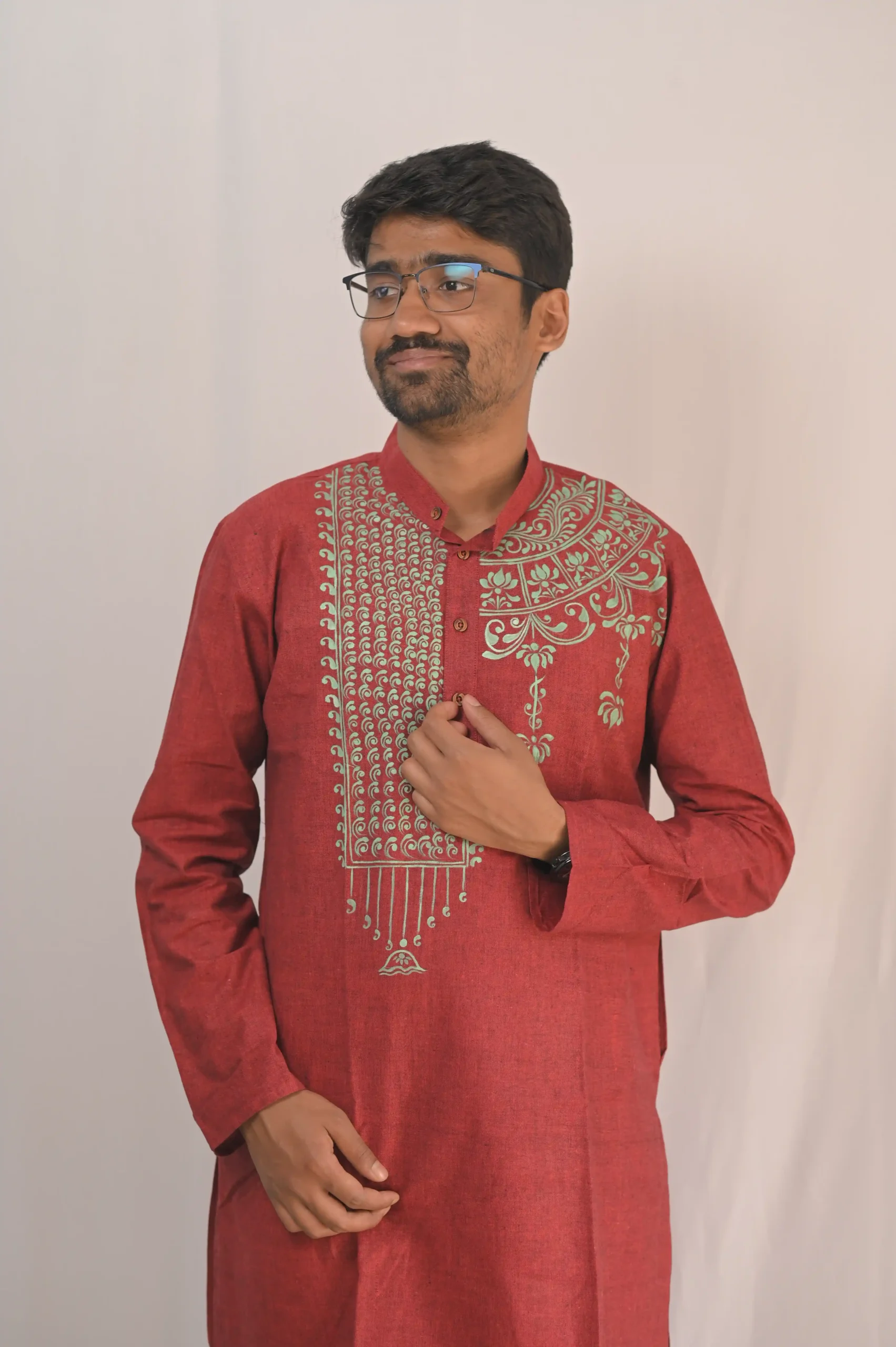 Elevate your ethnic wardrobe with this sophisticated Men’s Maroon Hand-Painted Cotton Kurta. Blending traditional craftsmanship with a contemporary silhouette, this piece is designed for the modern man who appreciates artistic detail and breathable comfort.