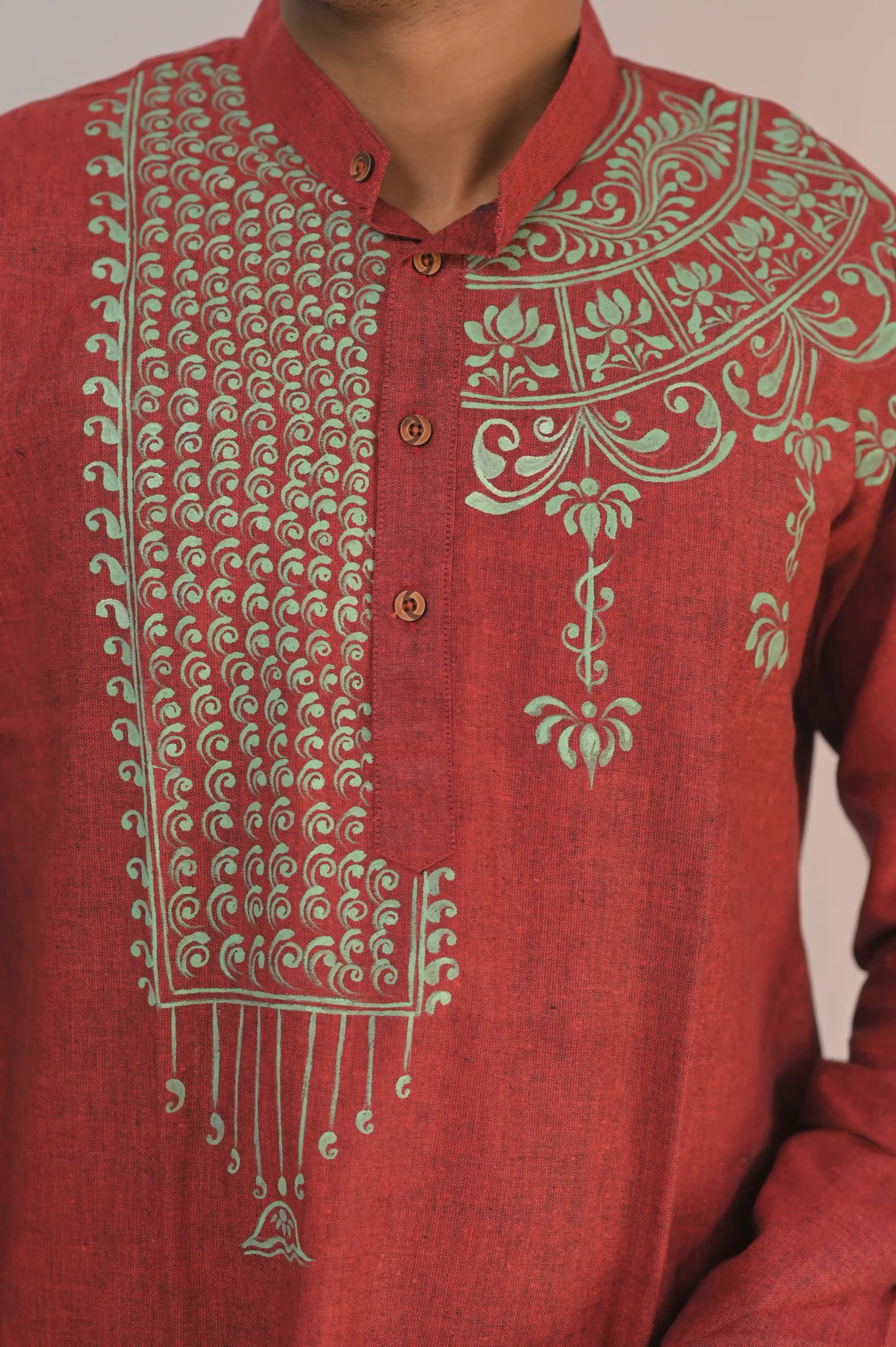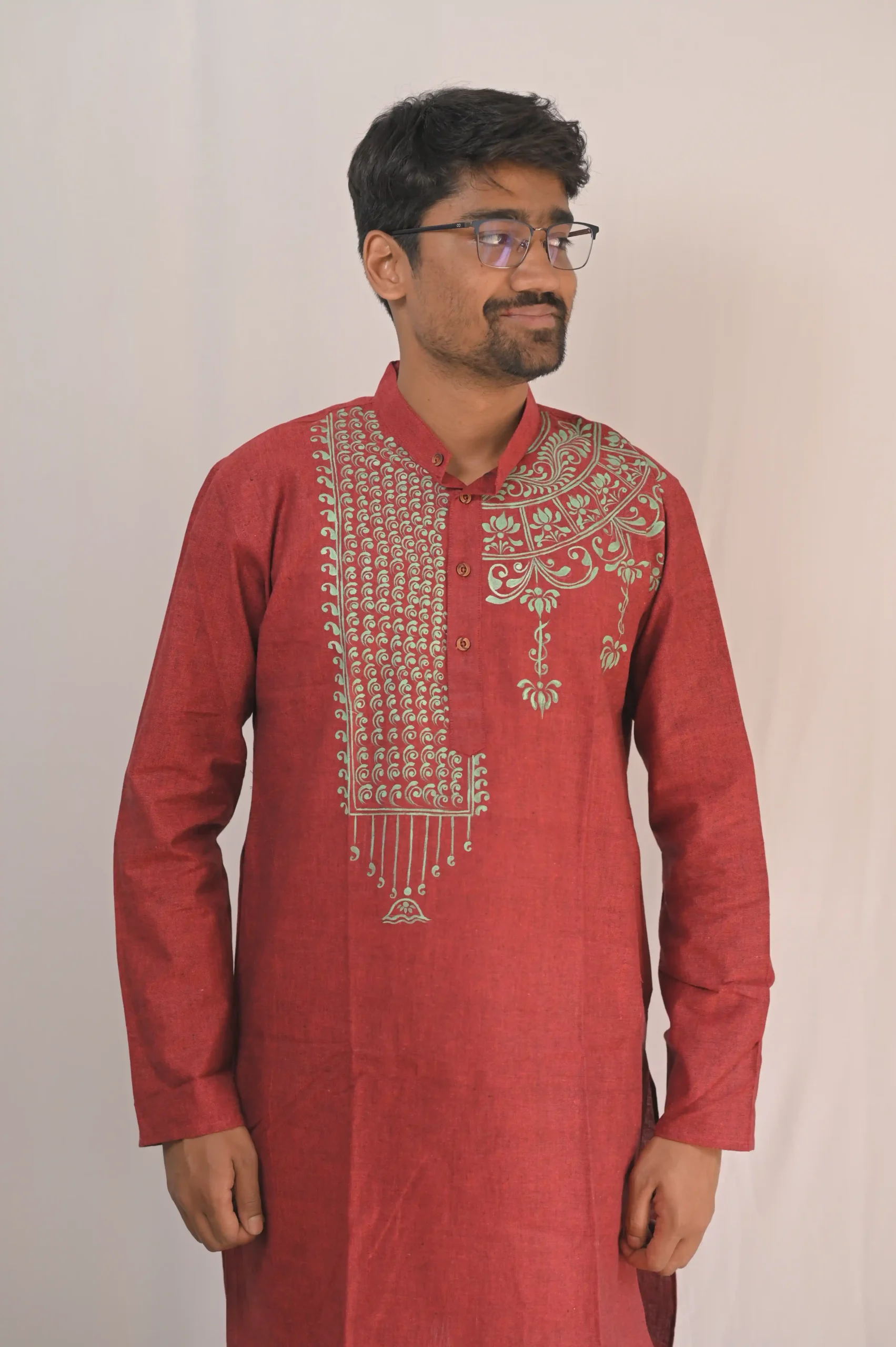 This rich maroon kurta features a striking, contrast hand-painted motif in a soft mint green. The asymmetrical design showcases intricate floral and vine patterns that flow elegantly from the shoulder and across the chest, making it a standout choice for festive occasions, cultural events, or semi-formal gatherings.