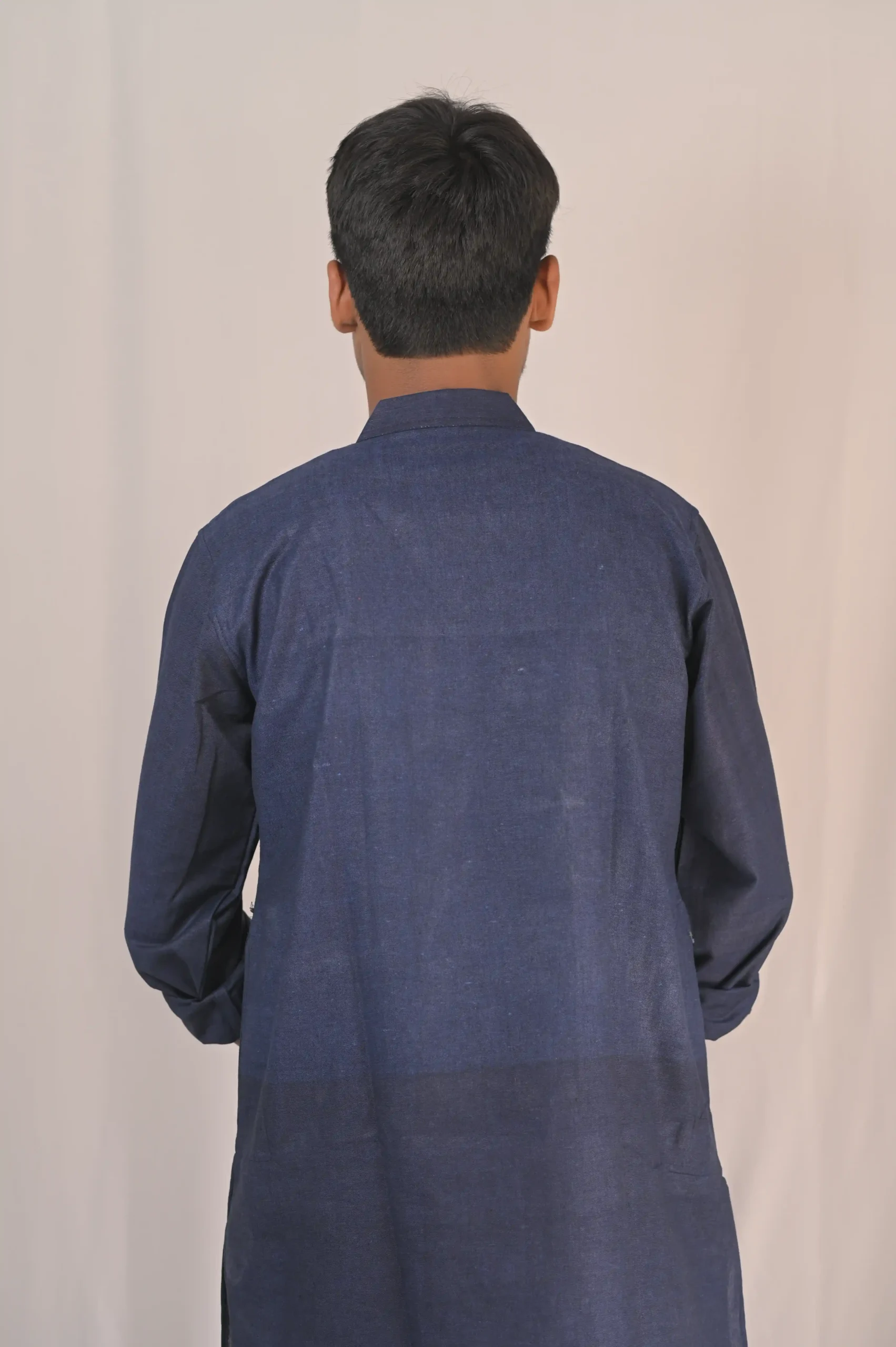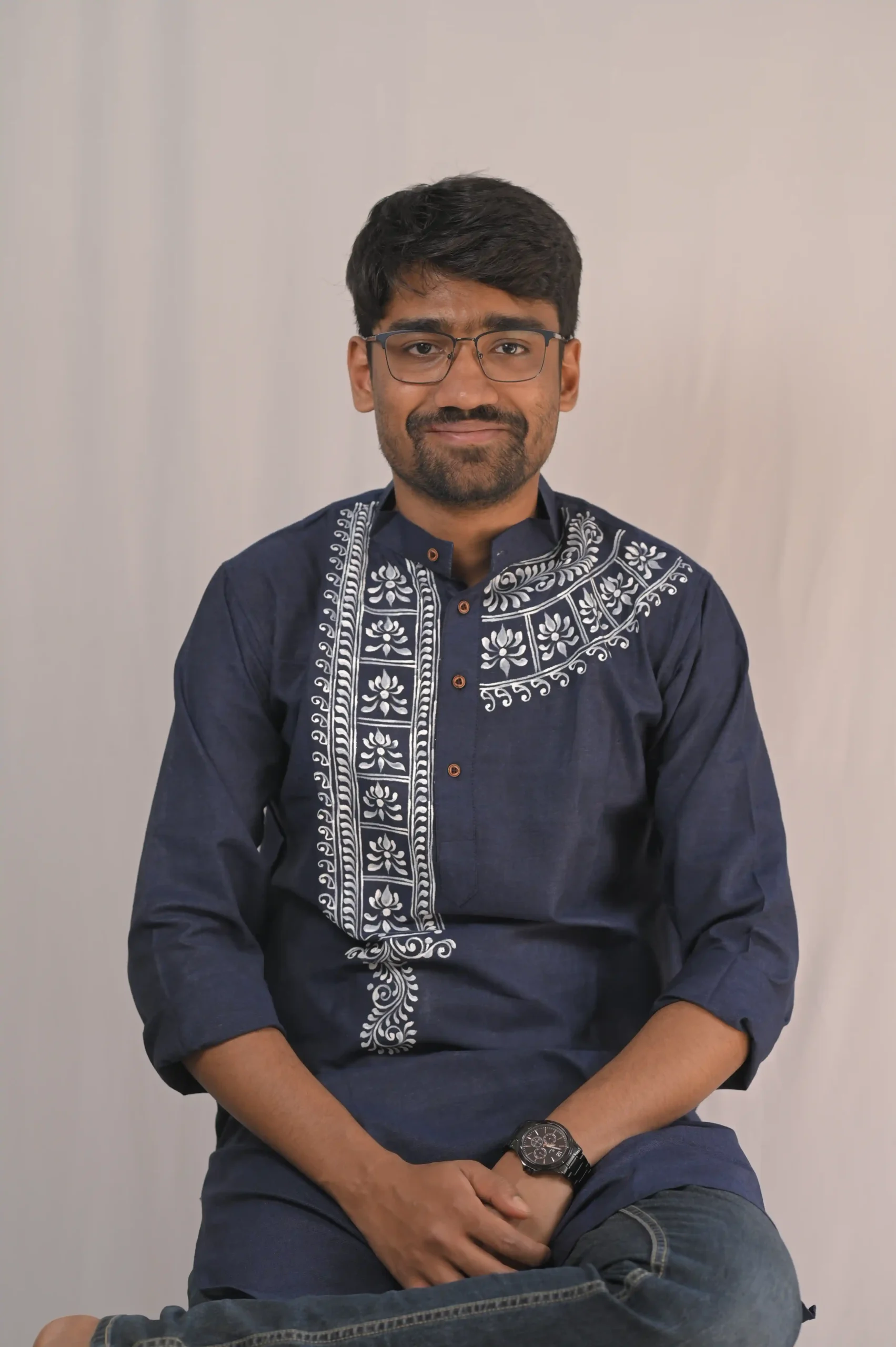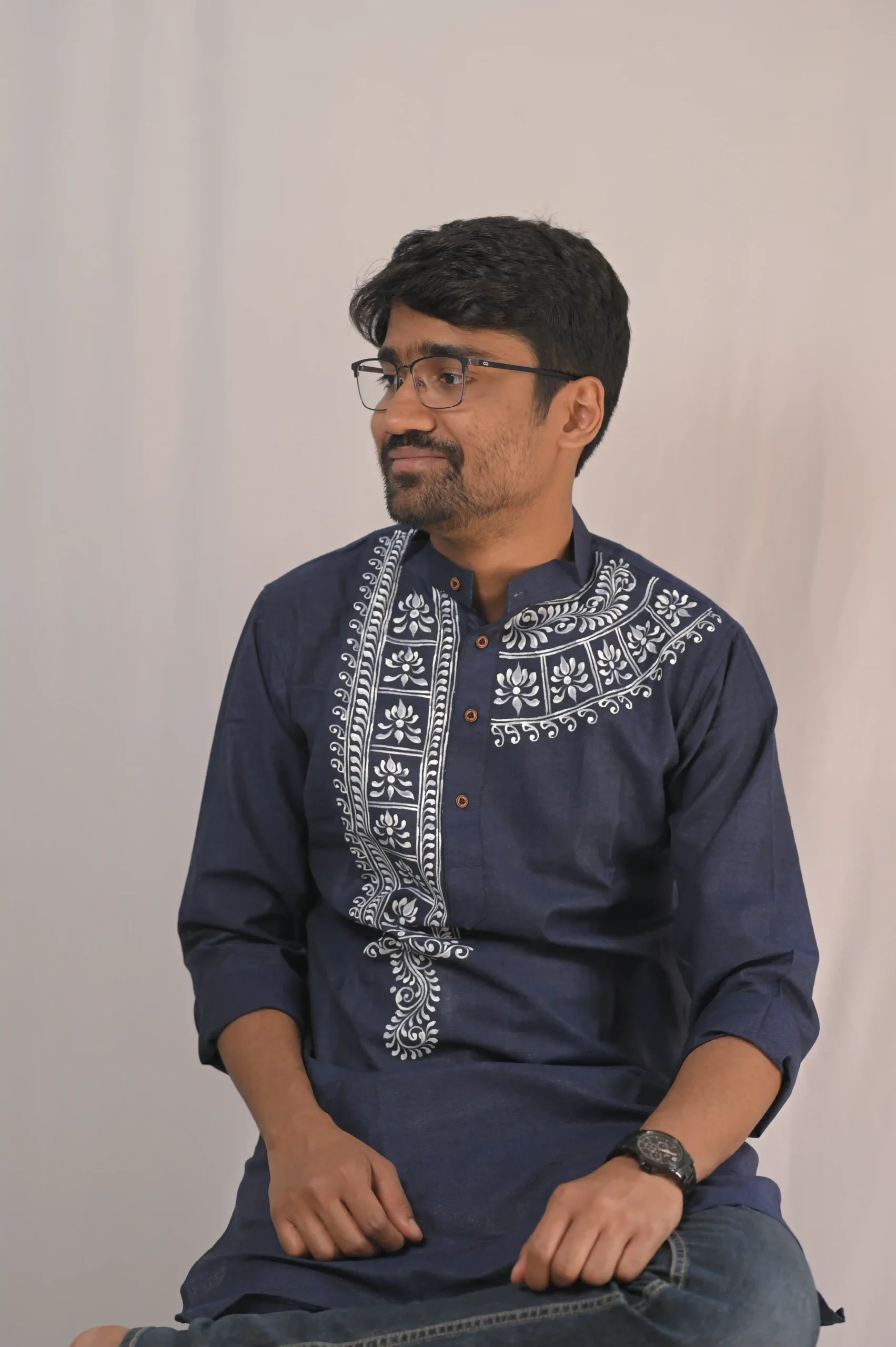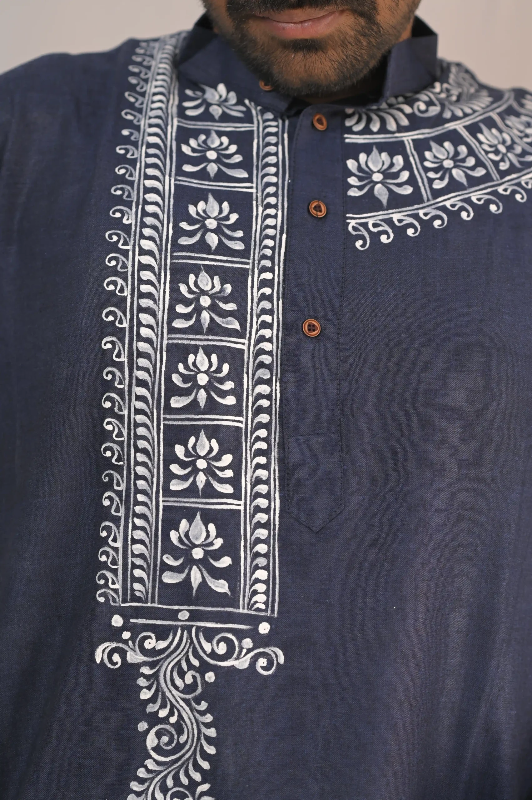 Make a bold statement with this Navy Blue Hand-Painted Festive Kurta. Unlike mass-produced prints, this piece features high-contrast white hand-painted floral and scroll motifs, giving it an authentic, one-of-a-kind character. Designed for the modern man who respects tradition but prefers a sharp, clean silhouette.