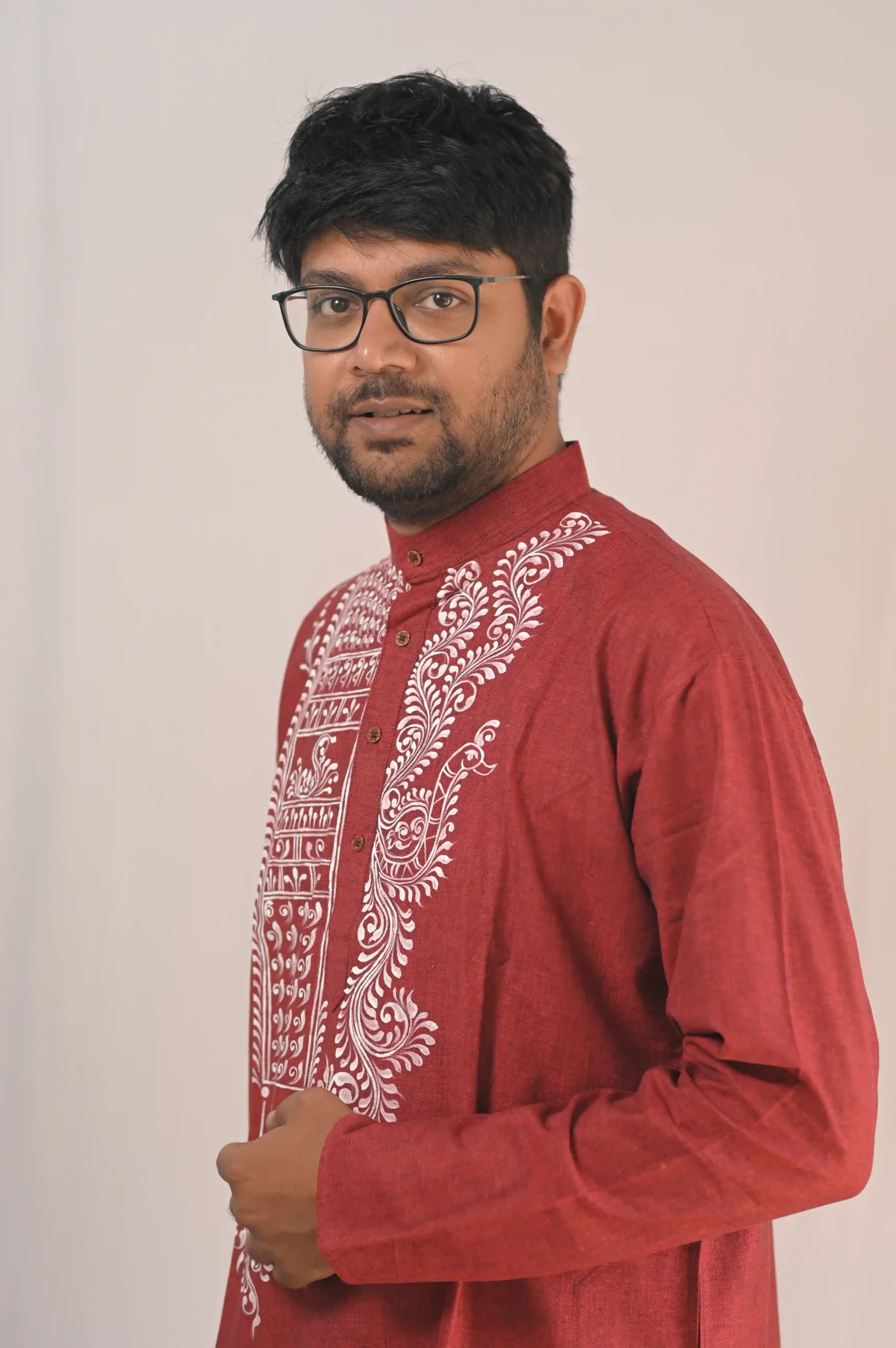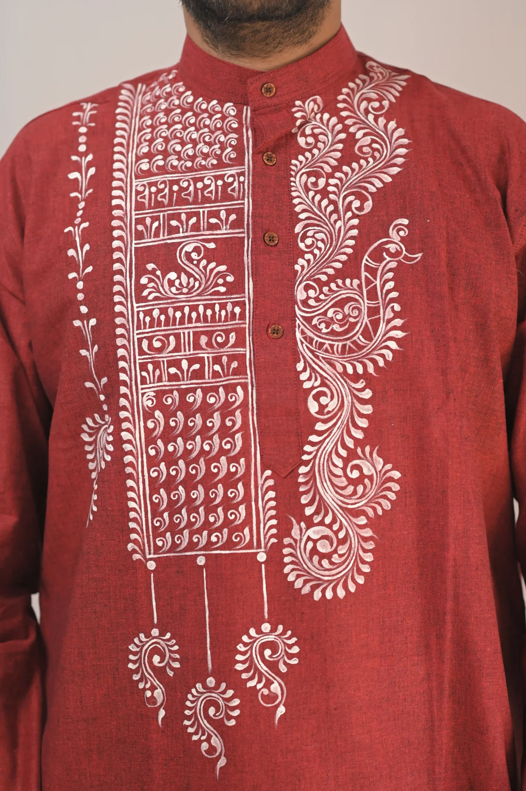 Embrace the timeless elegance of traditional craftsmanship with this exquisite deep red Khadi cotton Punjabi. Celebrating the rich heritage of authentic Indian art forms, this piece features intricate, hand-painted alpona motifs in stark white. The traditional Bengali folk art detailing gracefully cascades down the front, showcasing delicate paisleys, geometric patterns, and floral vines that capture the essence of festive joy and cultural pride.