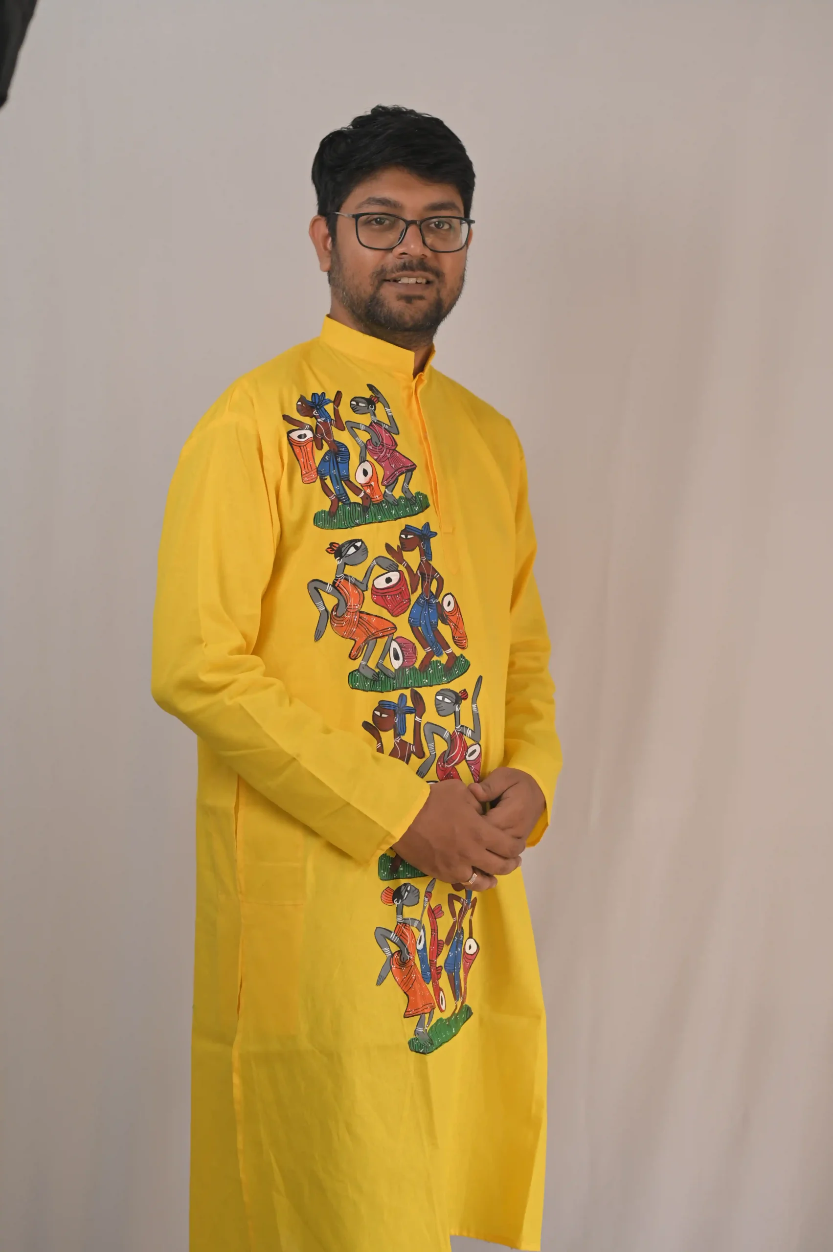Stand out in this bright yellow pure cotton kurta featuring authentic hand-painted Potochitra tribal art. Breathable, artistic, and perfect for Haldi, weddings, and festivals. Shop the heritage collection.