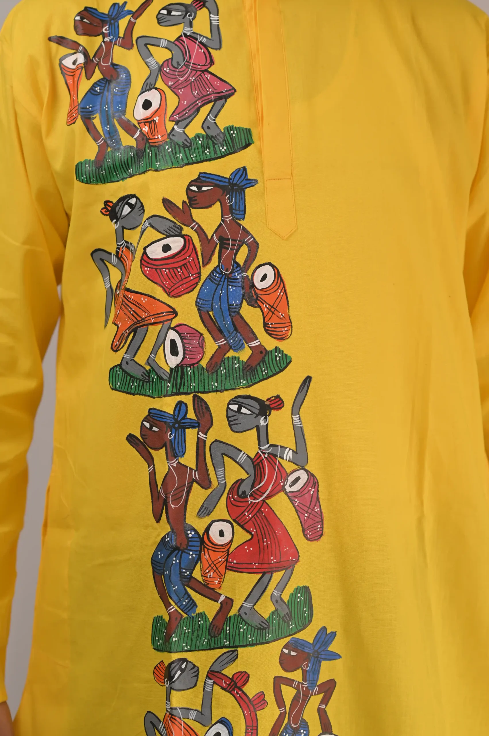 Illuminate your festive wardrobe with our Vibrant Yellow Potochitra Pure Cotton Kurta. This striking piece combines the sun-kissed energy of bright yellow with the intricate storytelling of Pattachitra (Potachitra) folk art. Hand-painted by traditional artisans, the vertical panel depicts rhythmic tribal dance and musical celebrations, making this more than just a kurta—it’s a celebration of life.