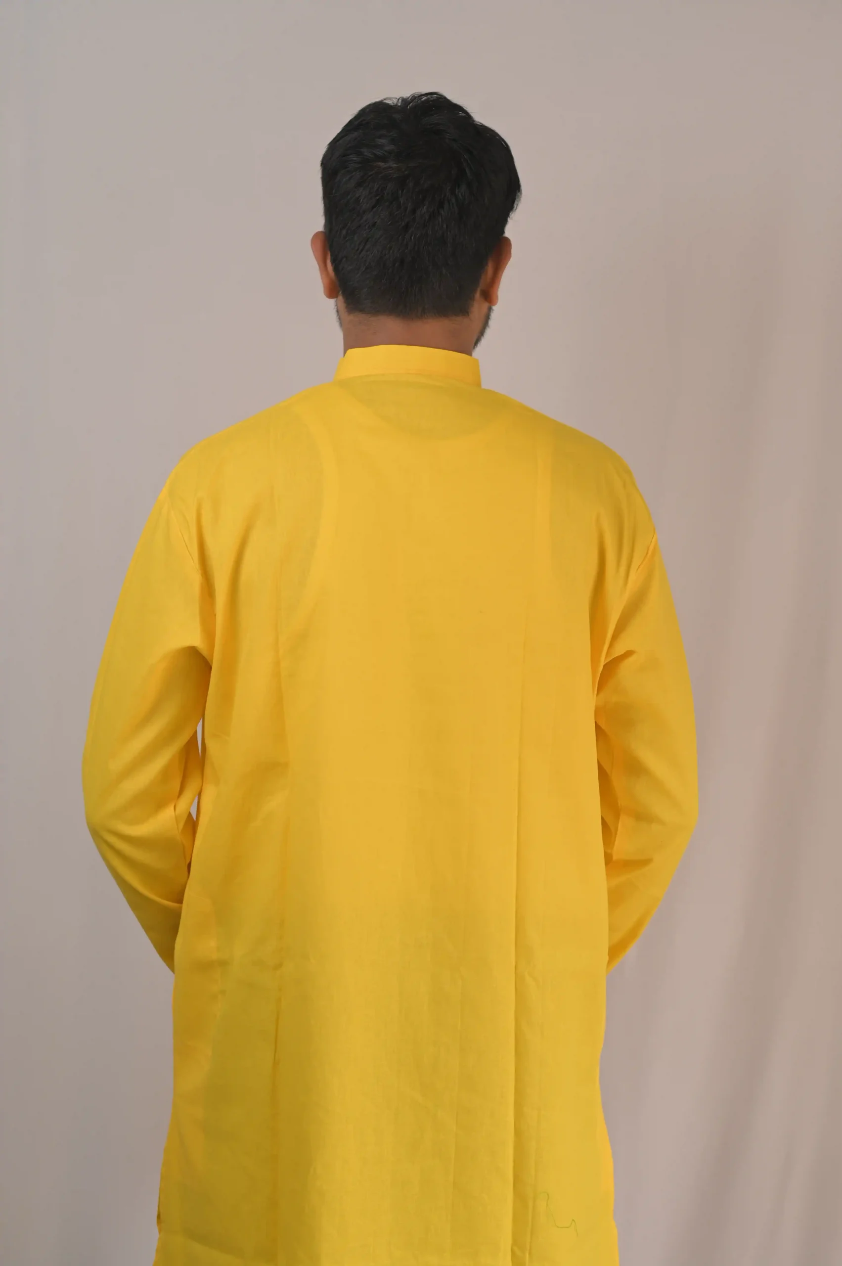 For a high-contrast traditional look, pair this yellow kurta with white or off-white dhoti pants or pajamas. For a modern fusion vibe, it looks exceptional with dark blue slim-fit jeans and tan leather kolhapuris.