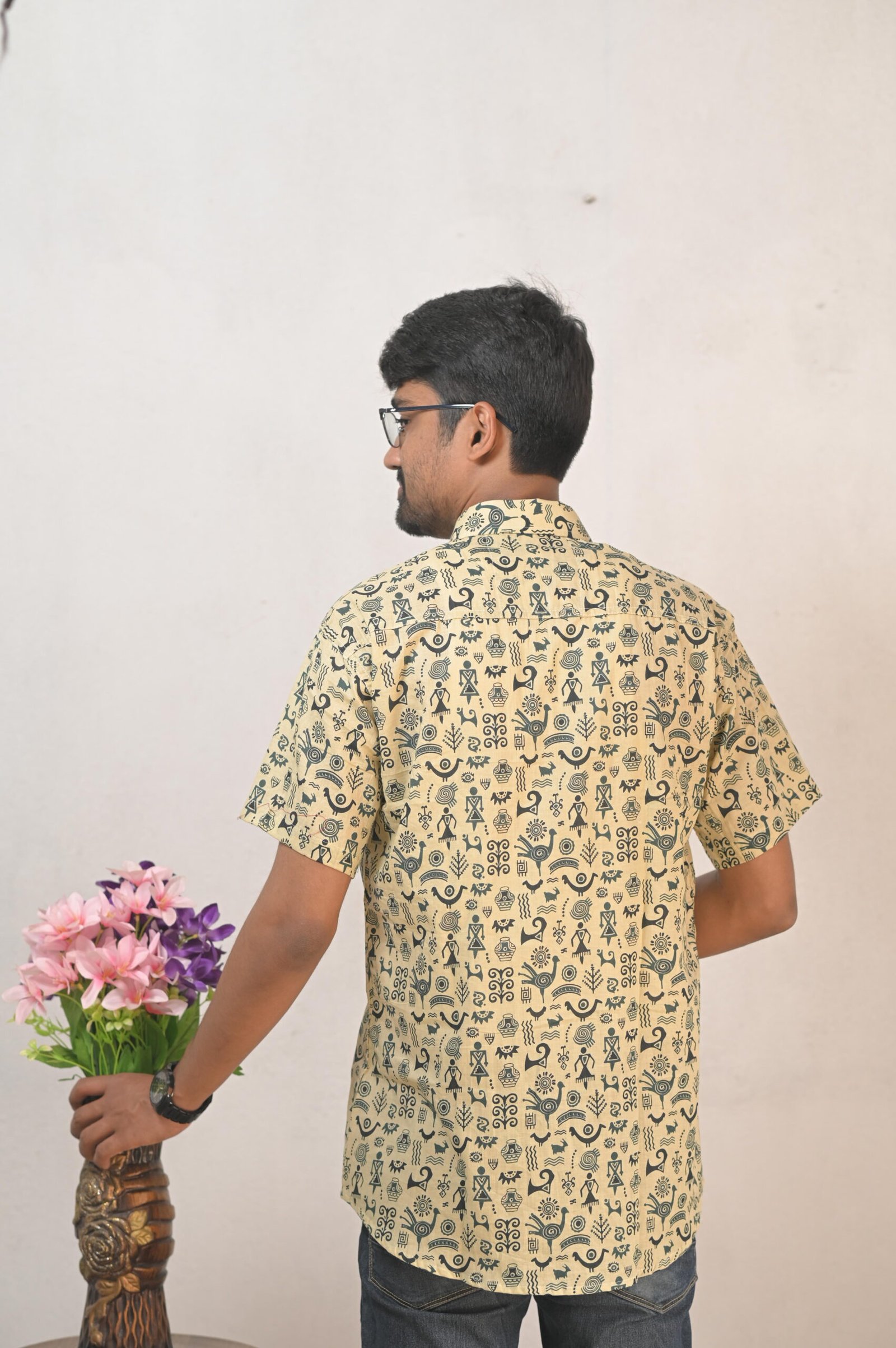 Celebrate everyday comfort with this handcrafted cotton shirt featuring all‑over Warli‑inspired tribal motifs in deep green on a warm sand‑yellow base. The breathable, lightweight cotton fabric, short sleeves and curved hem make it perfect for summer and relaxed outings. Finished with a classic collar, wooden buttons and a neatly matched chest pocket, this shirt pairs effortlessly with denims, chinos or linen trousers for a smart yet easygoing look.