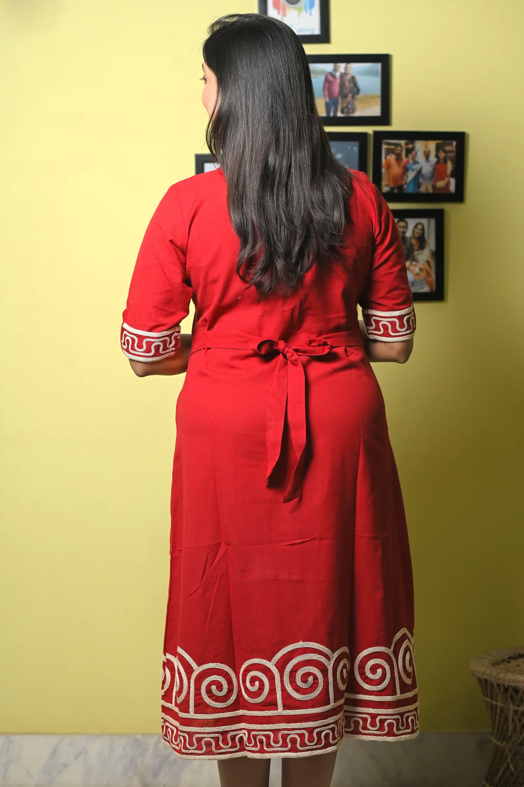 The standout feature is the intricate off-white embroidery adorning the hemline and sleeves. The swirling, wave-like scallop patterns create a beautiful contrast against the bold red fabric. For a custom fit, the dress includes a matching tie-back waist belt, allowing you to cinch the silhouette or wear it relaxed.